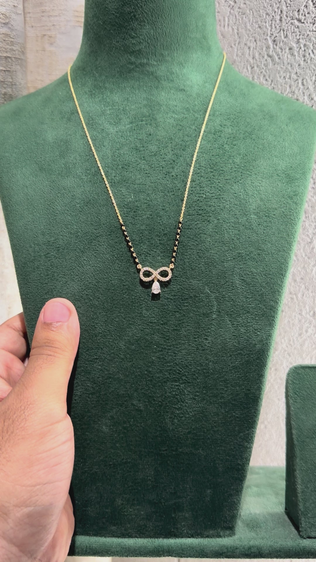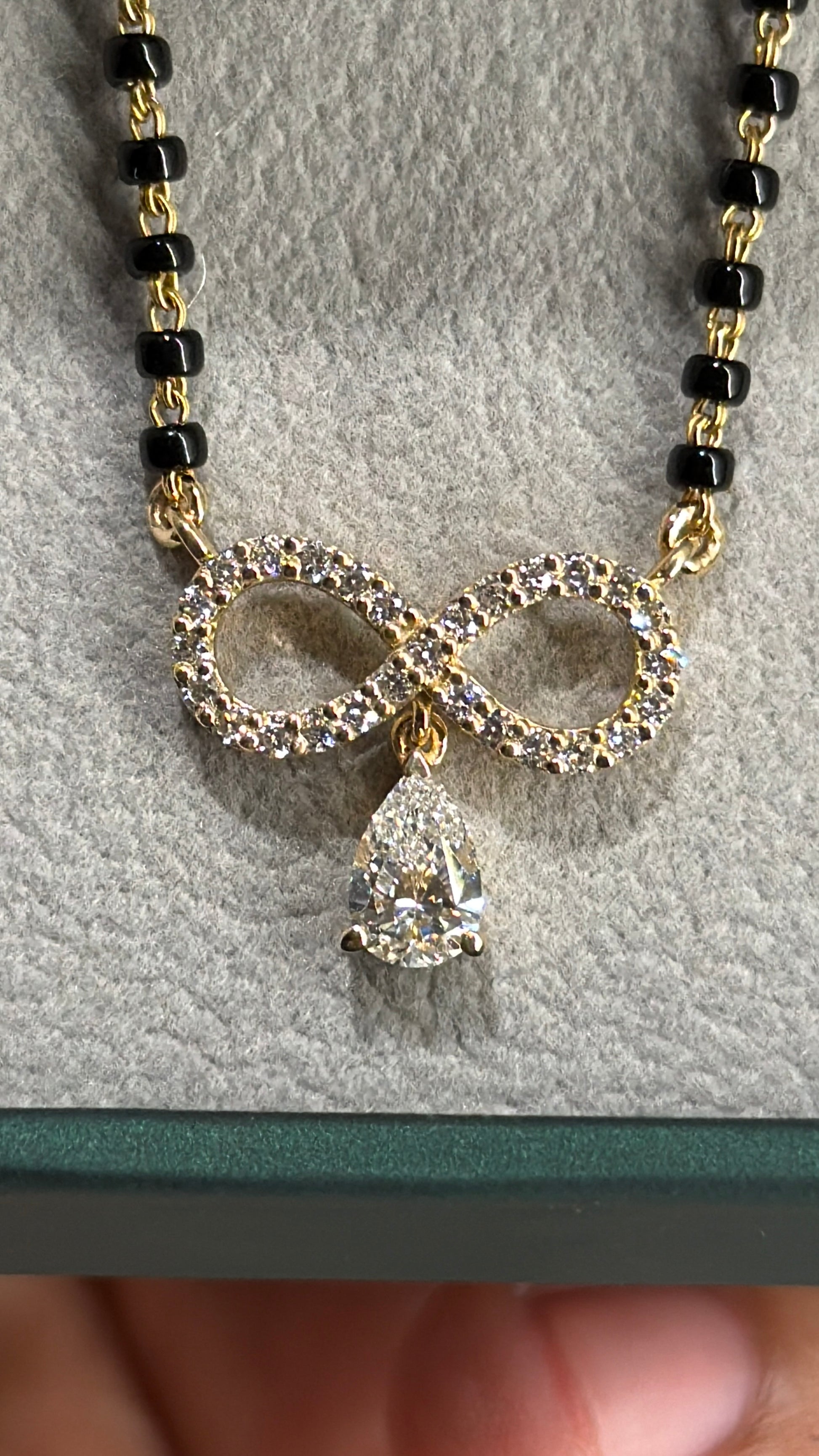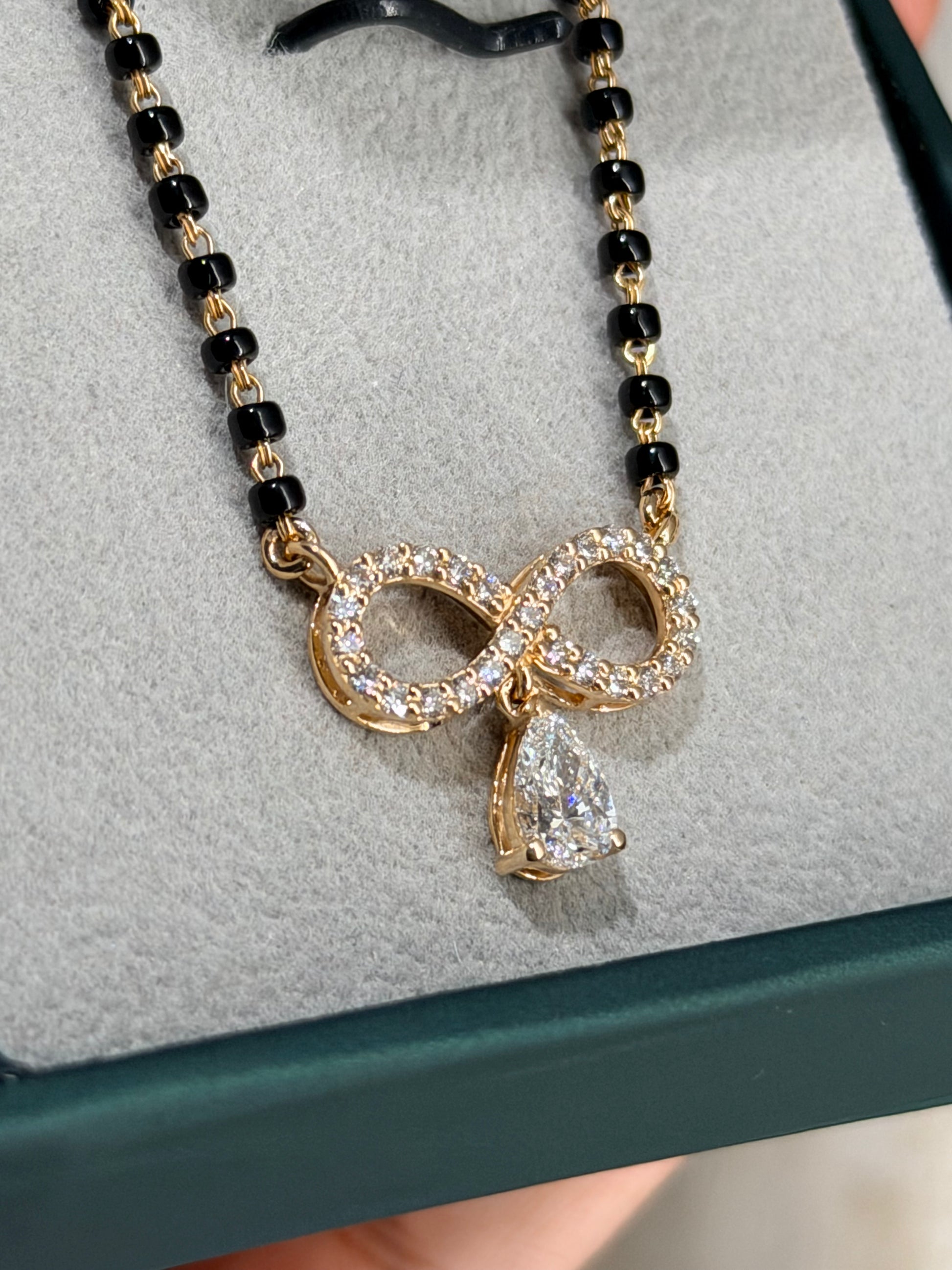A Versatile Mangalsutra and At the centre sits an Infinity Motif, with a 0.75 Carat Pear Shaped Diamond gently dangling below.