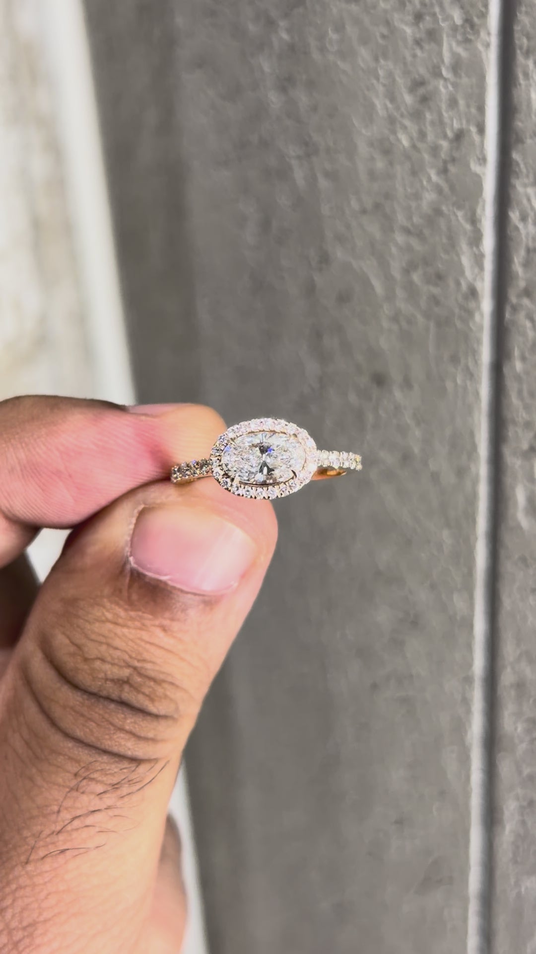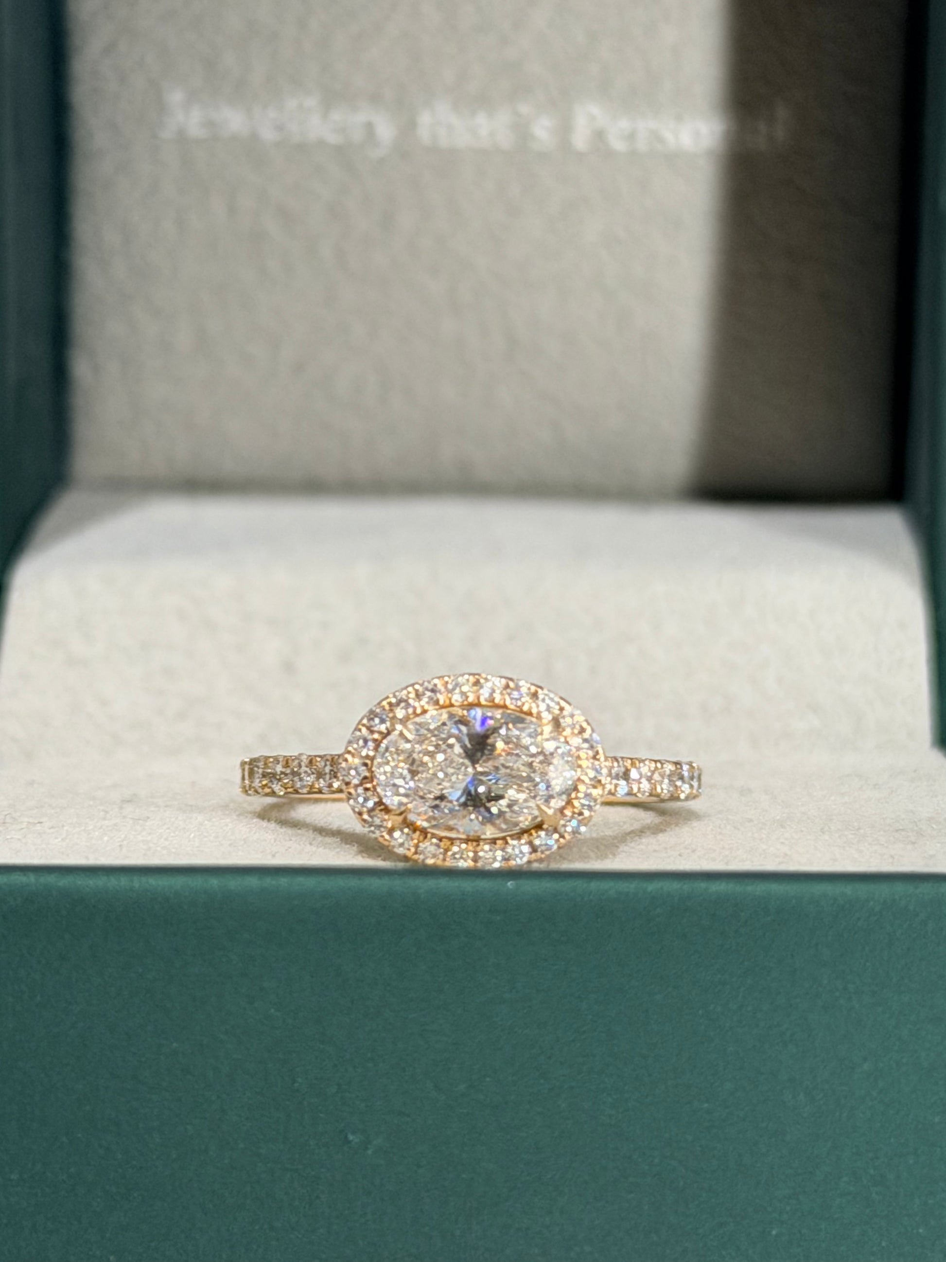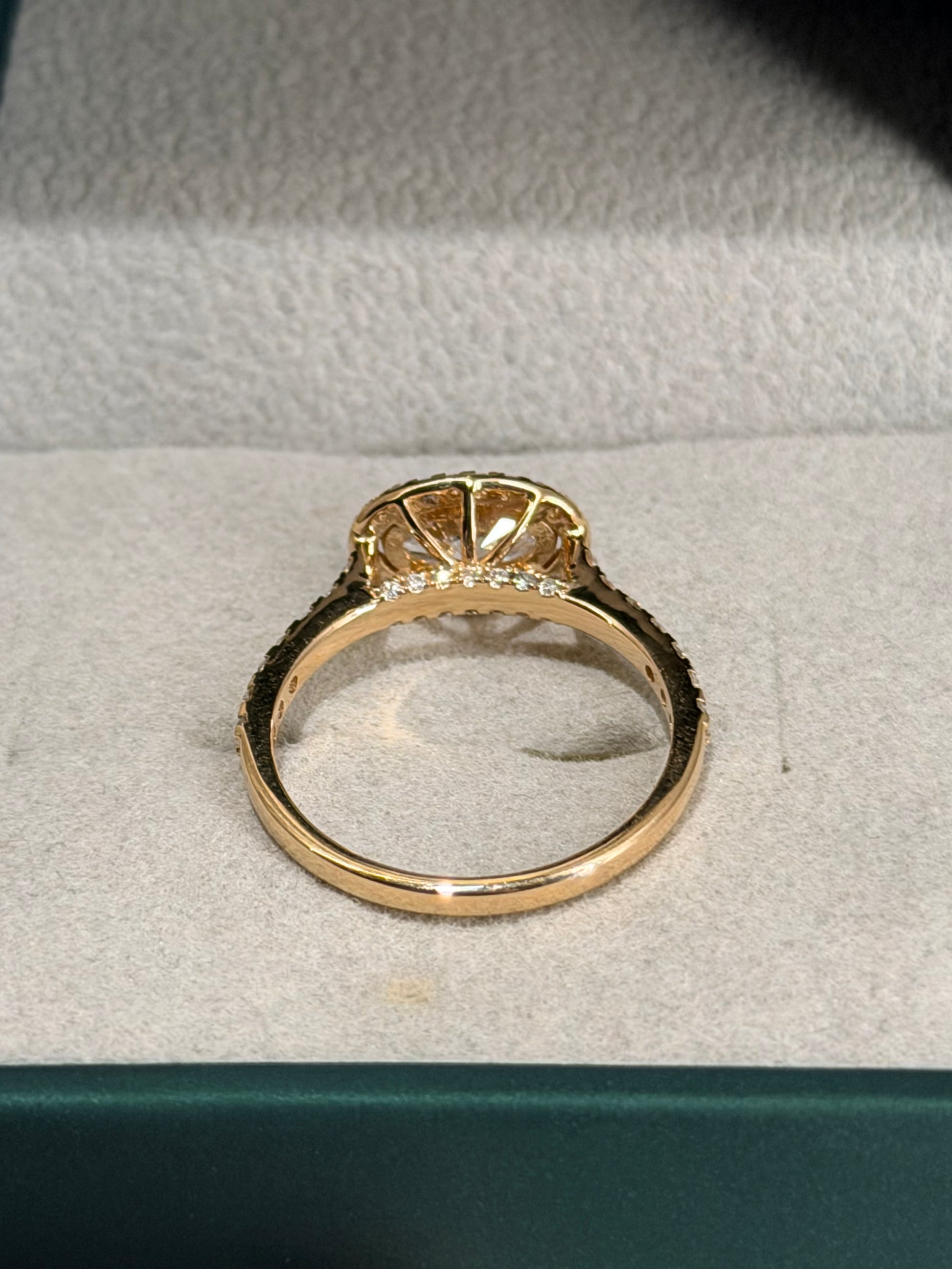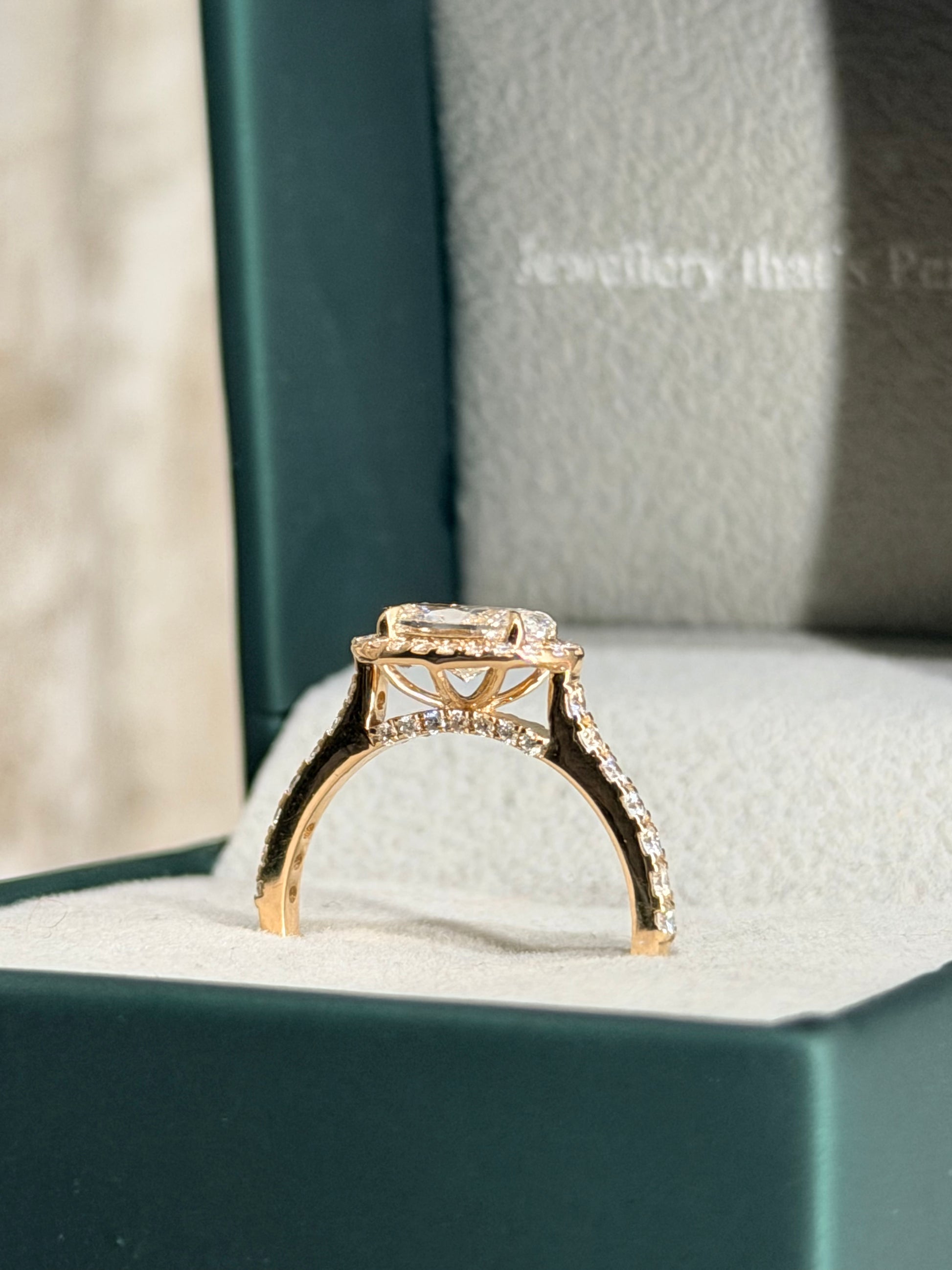 It’s framed by a Halo of small Diamonds, with a matching Pavé Band, adding up to 0.36 carats of extra sparkle.